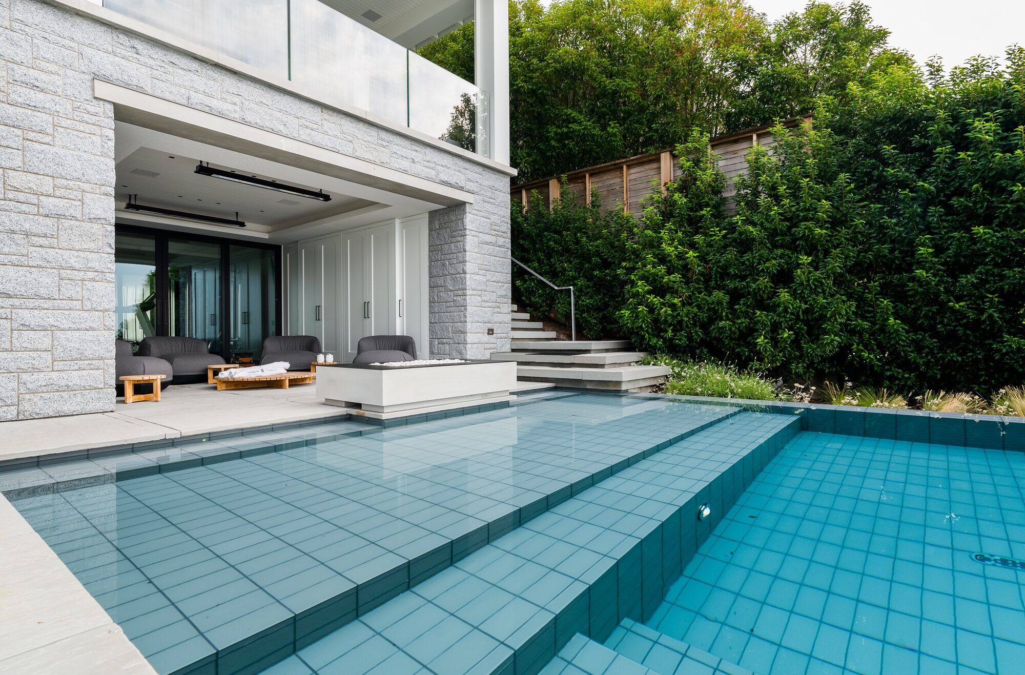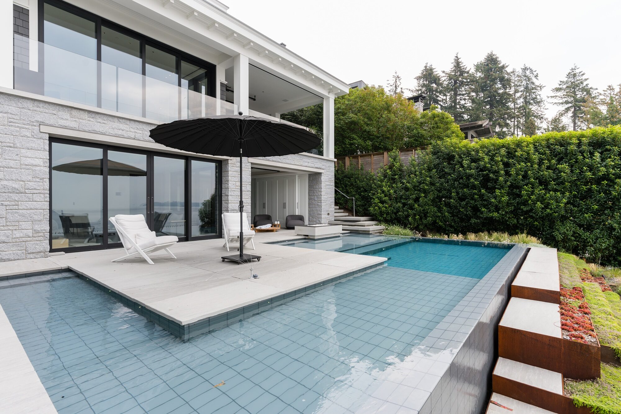 The clever part of this design is the many functional mini spaces that cohesively fit together. From within the house, a cheerfully inviting exercise room features nano doors to enjoy the incredible view over the infinity edge pool. This inspiring vista makes exercising appealing even when the elements tend to keep one indoors. A covered alcove in front of the exercise room keeps one sheltered yet still able to enjoy late night fireside chats with its overhead heating and comfy chairs. The placement of the fire pit next to the pool shows the flames dancing across the water, a mesmerizing effect.