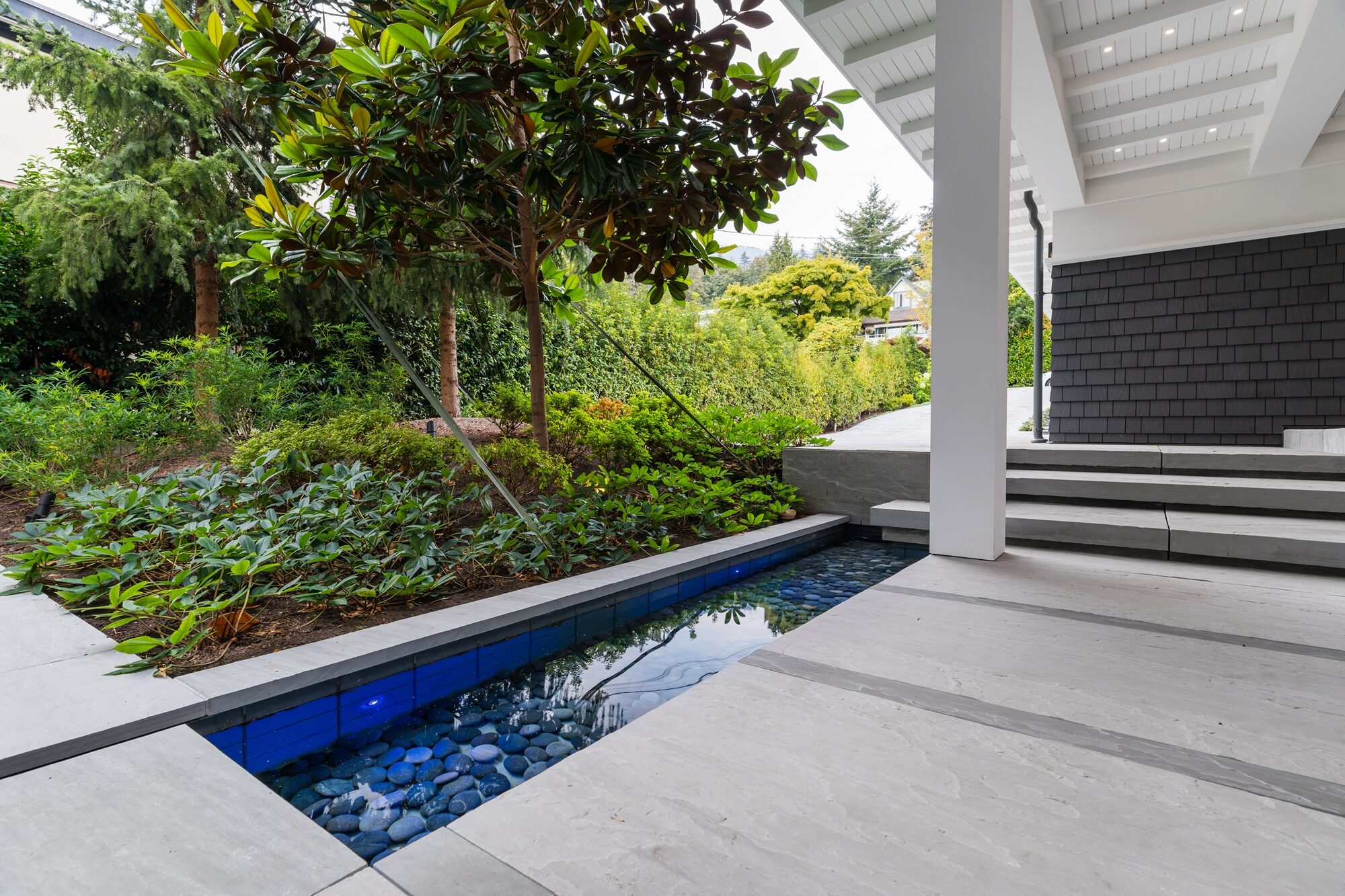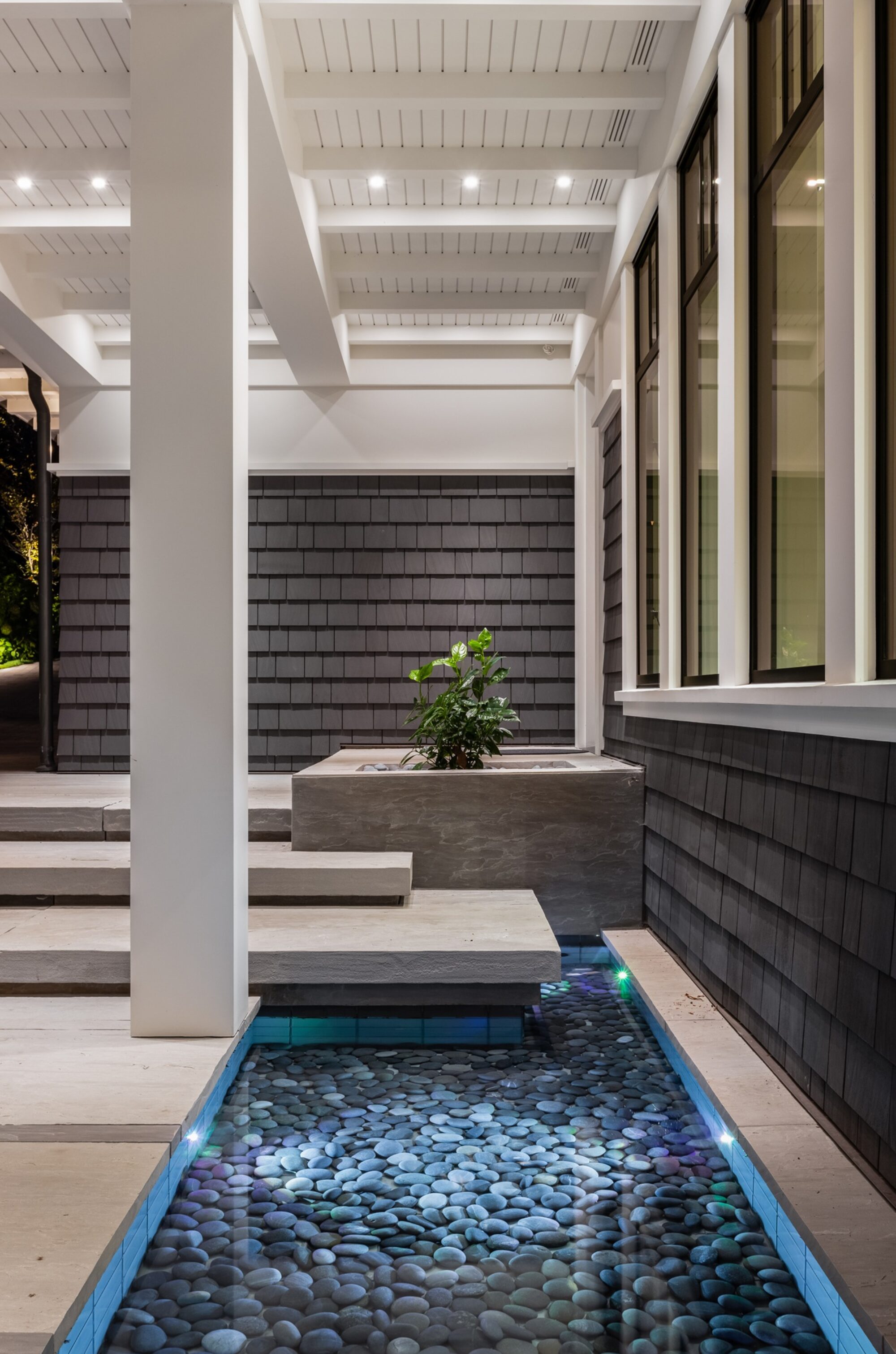At the front entry of the house, a welcoming water feature greets the guests. Two reflective pools on either side of the walkway bring a sense of peace to the entrance. White lights above the walkway highlight the flow of the water and the sense of tranquility. The use of large pebbles fits with the home’s color scheme of blue and grey, almost like a rock-lined lake. Lending a natural element that blends the man-made with nature.