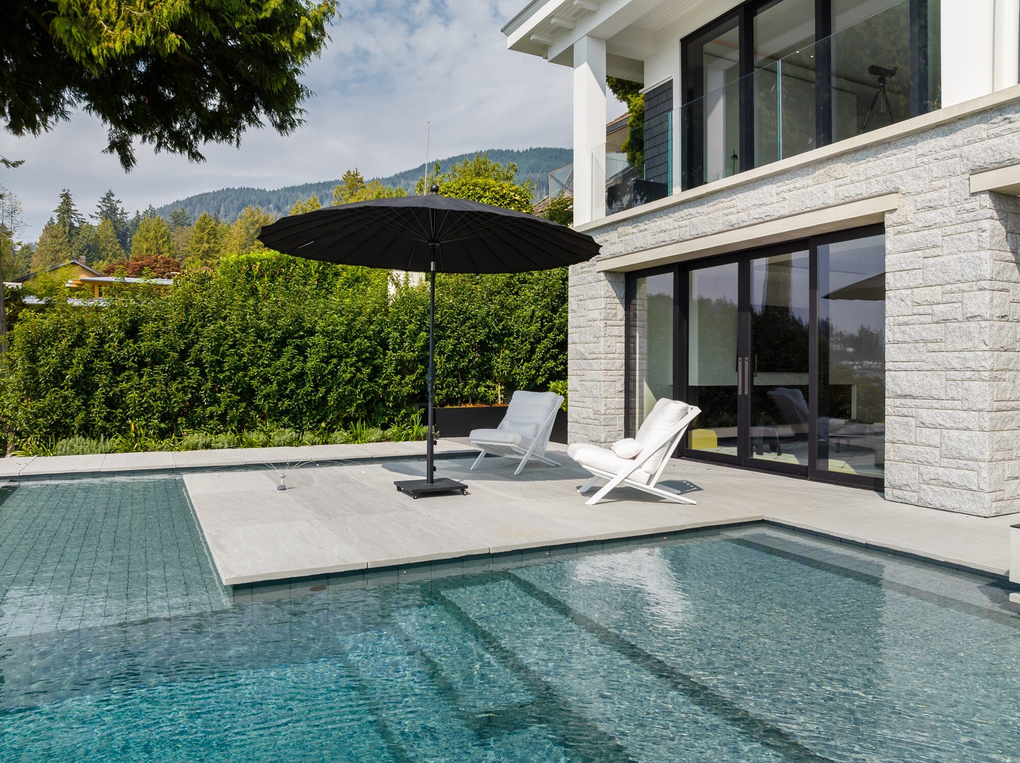 Further down, the U-shaped pool has a unique children’s swim area on one side featuring a shallow swim lane. On the sun terrace, which is strategically placed between the main pool and kids’ area, one can beat the heat while lounging under the umbrellas. The main pool area has a lounging ledge, also known as a Baja shelf, at 12” depth, then an underwater bench at 18” depth followed lastly to a swim space at 4’0” depth.