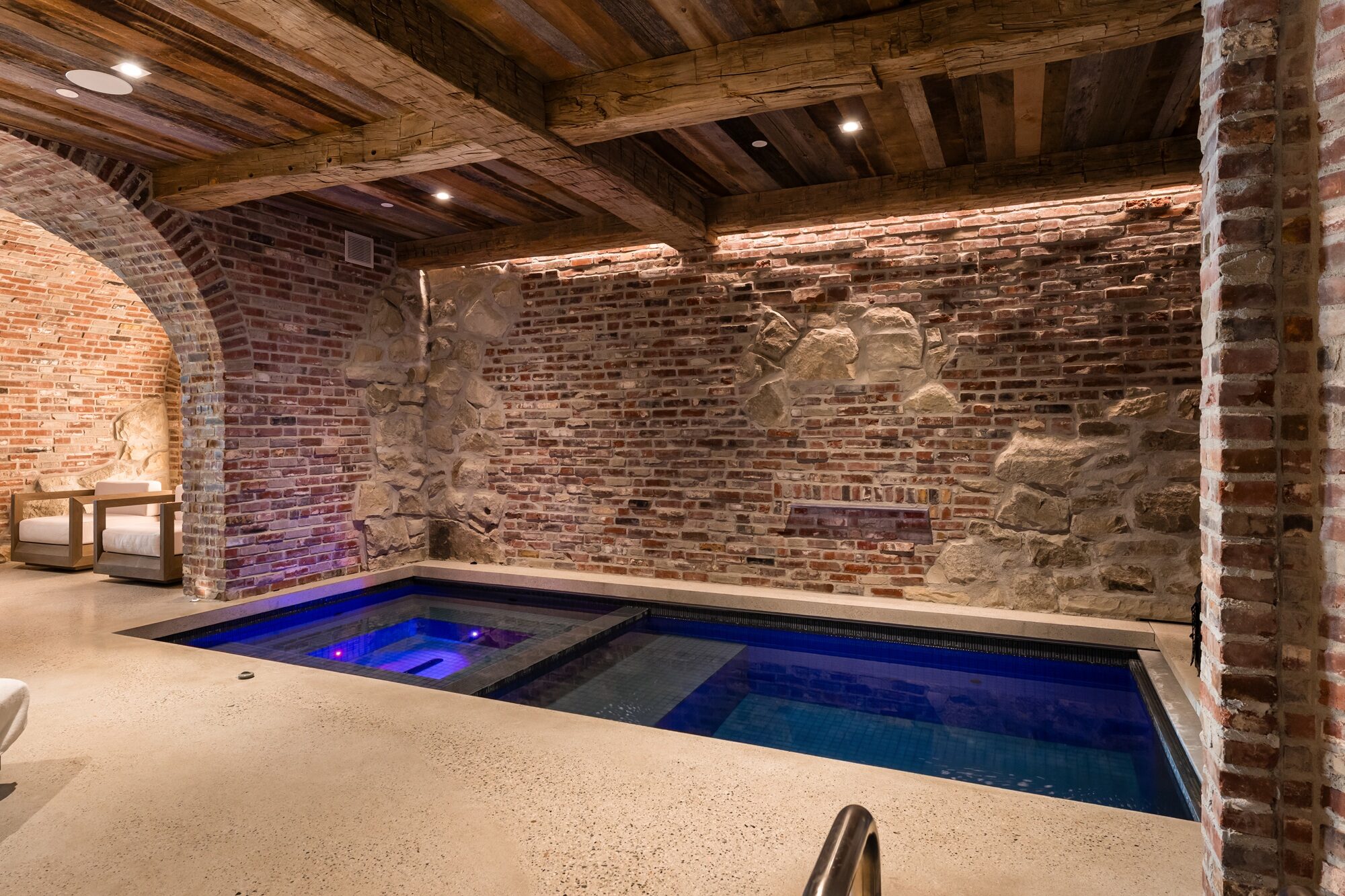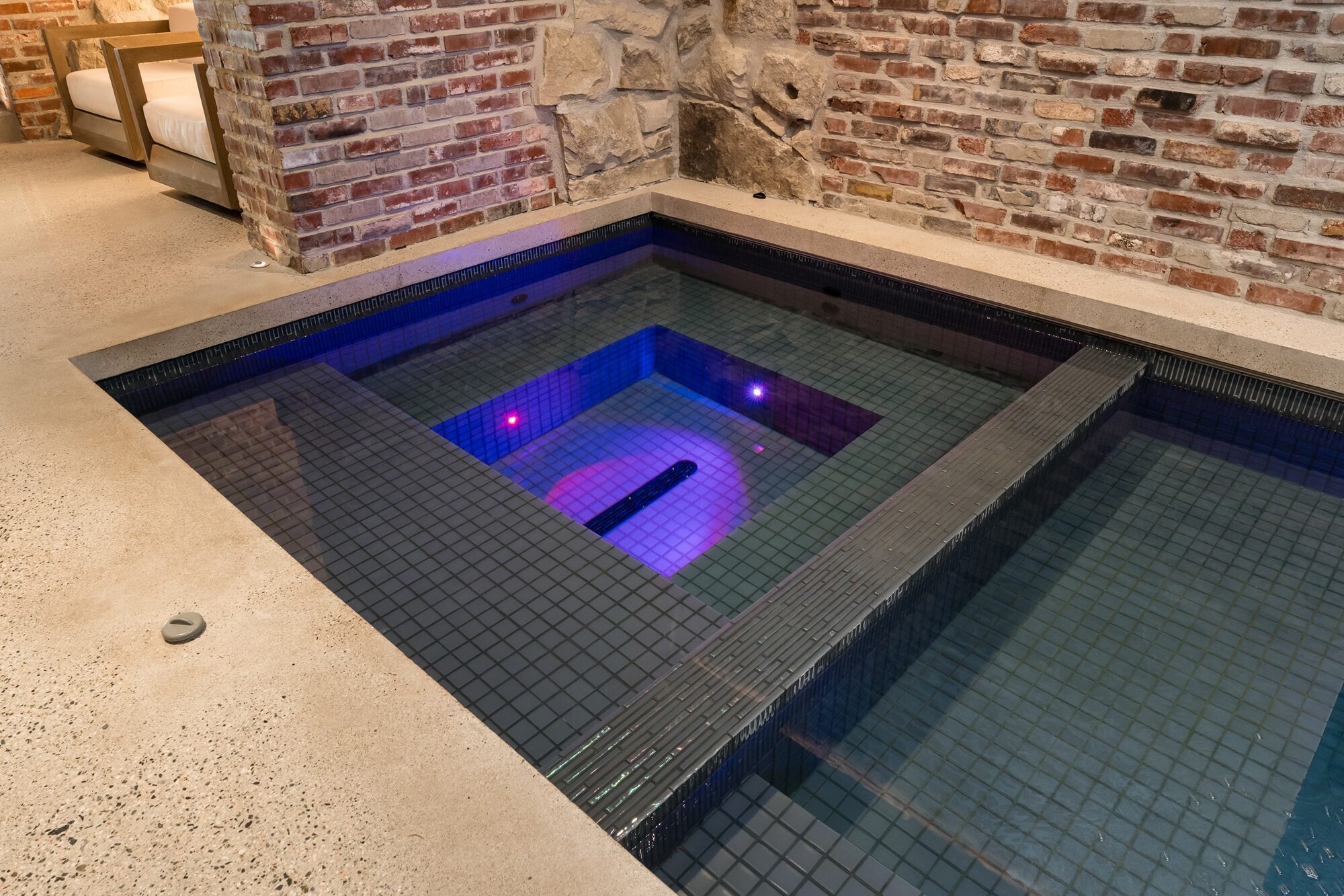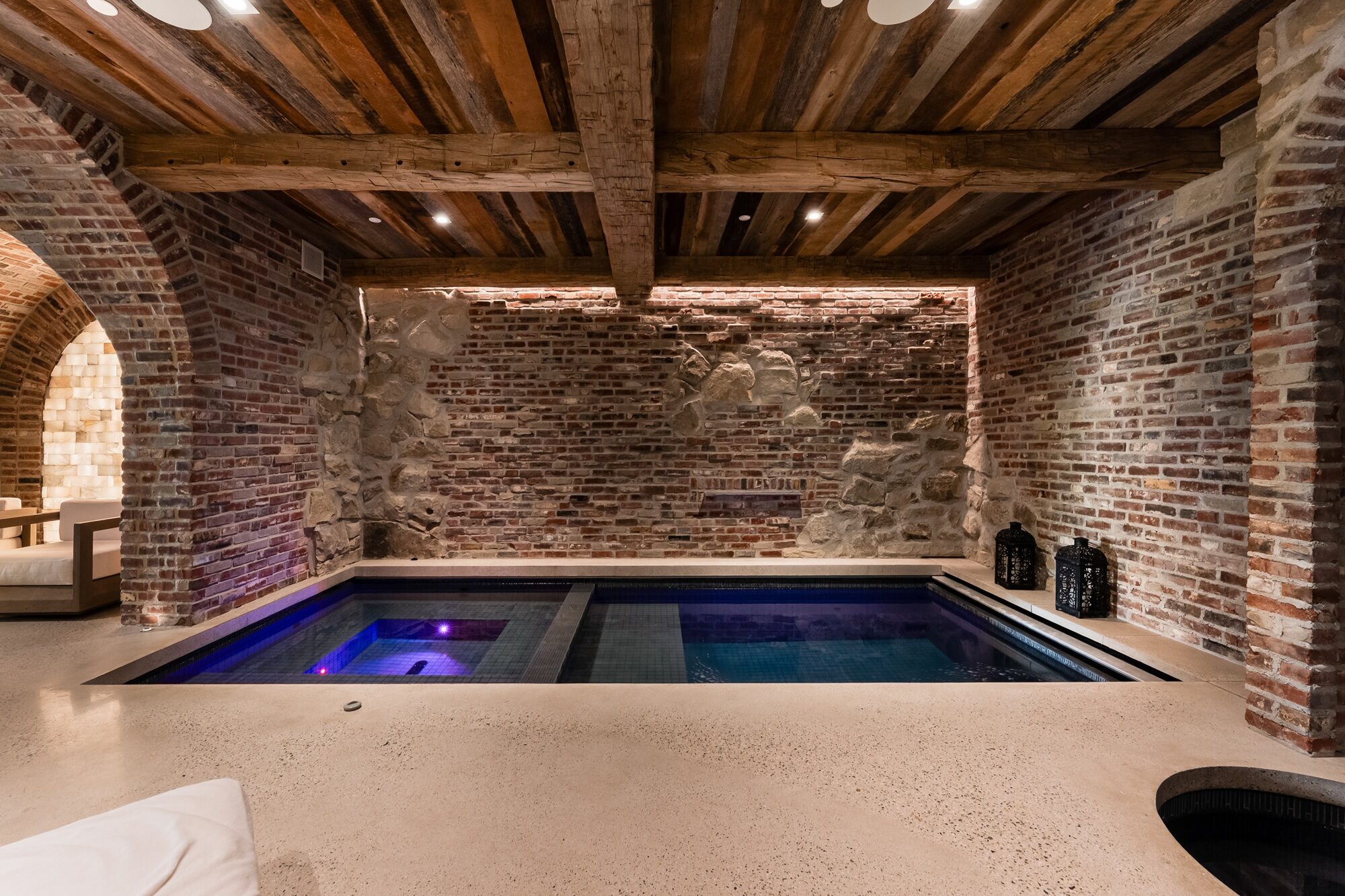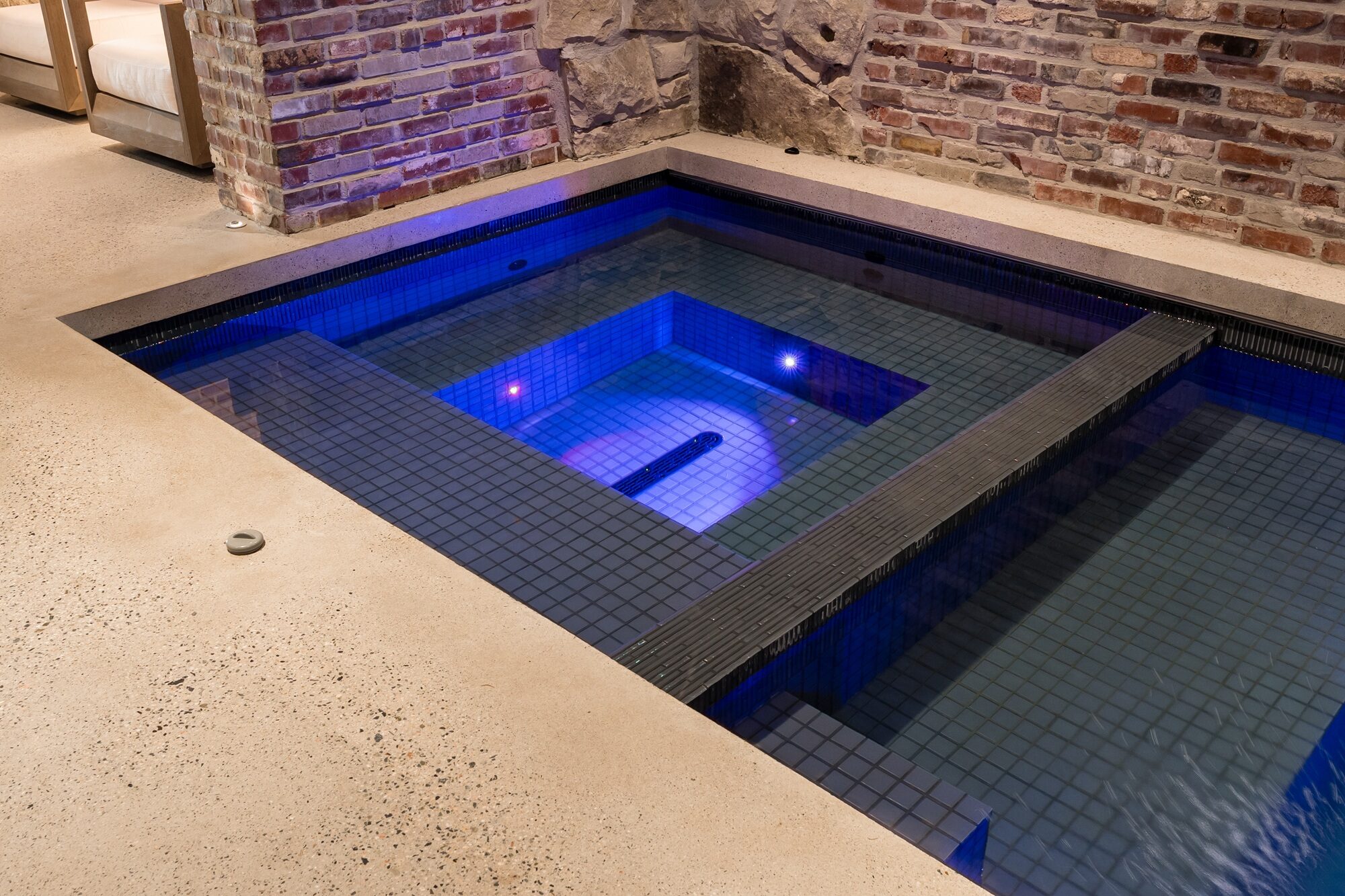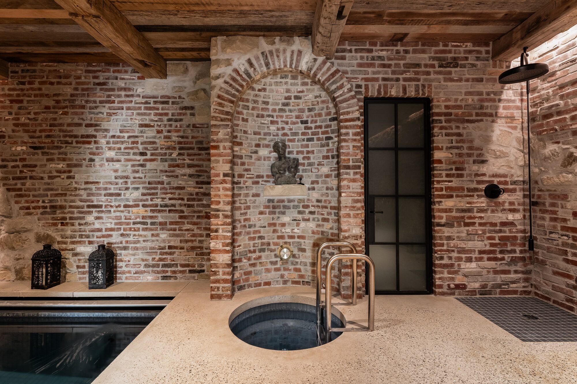 Inside the residence, a secondary pool and whirlpool combination offers a private wellness retreat framed by rustic brick arches and timber ceilings. Clad in a 2″ x 2″ Icestix Evening Glass and River Rock tile combination, the water takes on deep jewel tones that contrast beautifully with the textured stone and brick surroundings. Linear accents in a 0.5″ x 3″ format of the Evening Glass colour trace the edges of the pool and whirlpool, adding a refined detail that subtly defines each zone within the compact footprint.