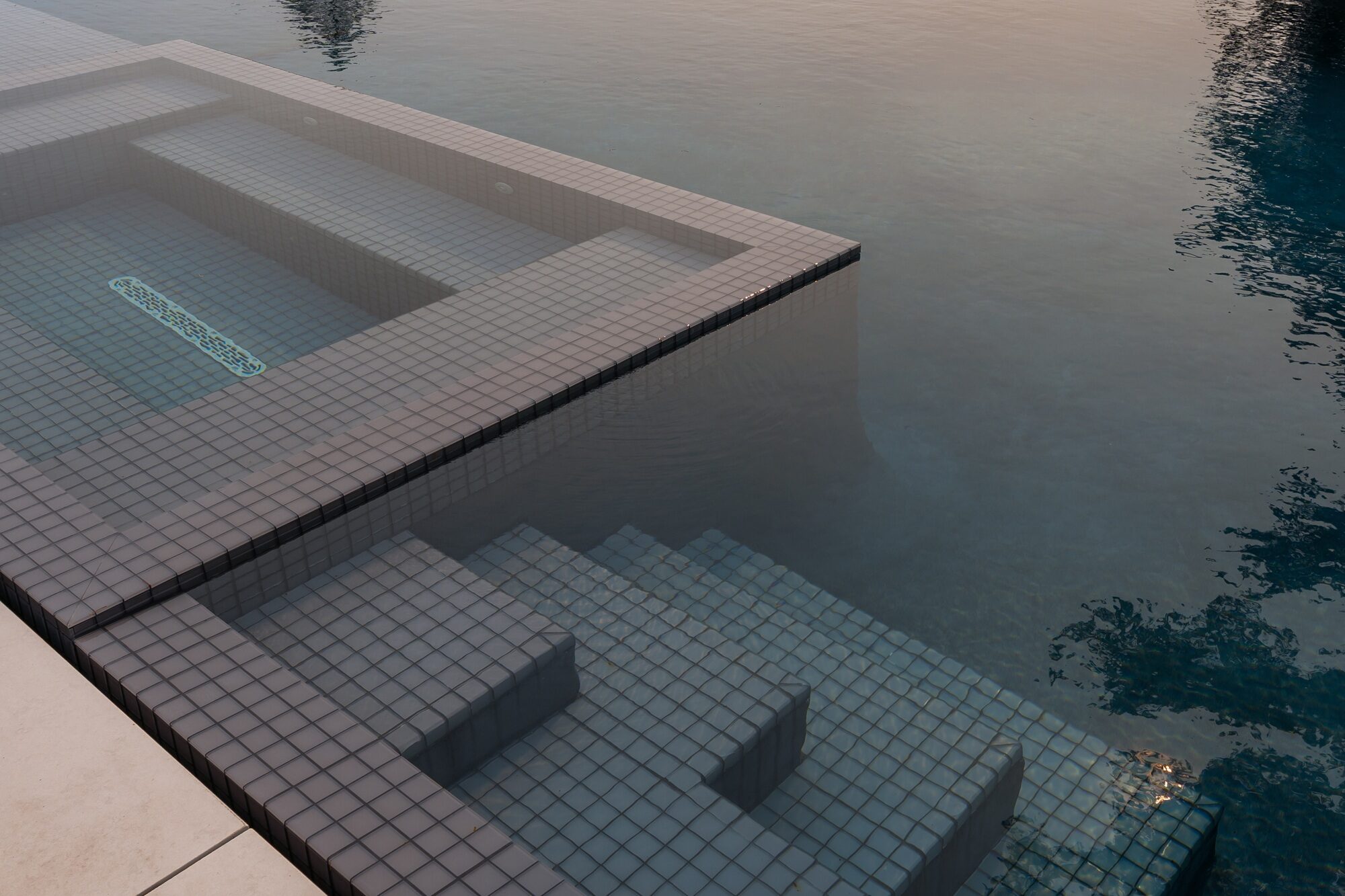 A rich charcoal plaster interior serves as the backdrop for the calm reflective surface of the water, emphasizing the clean geometry of the flood edge design. The perimeter tile band in monsoon glass tile adds a subtle shimmer at the waterline, tying into the fully tiled inset whirlpool for a cohesive look between pool and spa.