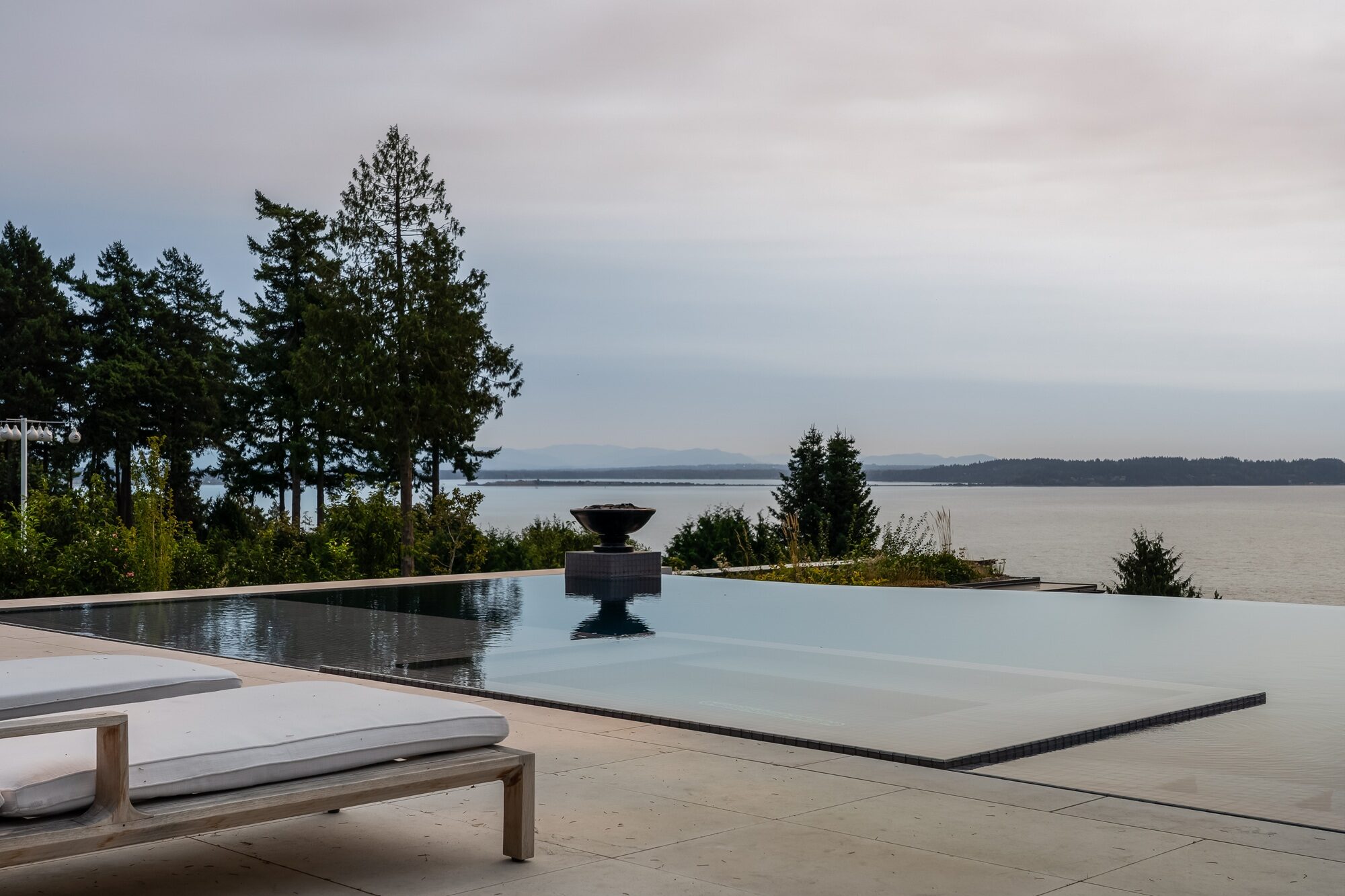 Ten discreet uplights illuminate the infinity trough after dark, transforming the falling water into a ribbon of light that visually extends the pool into the surrounding gardens. Fire pedestals at the end of the pool introduce a sculptural flame element, playing off the reflective charcoal plaster finish and glass tile band for a refined, contemporary aesthetic.