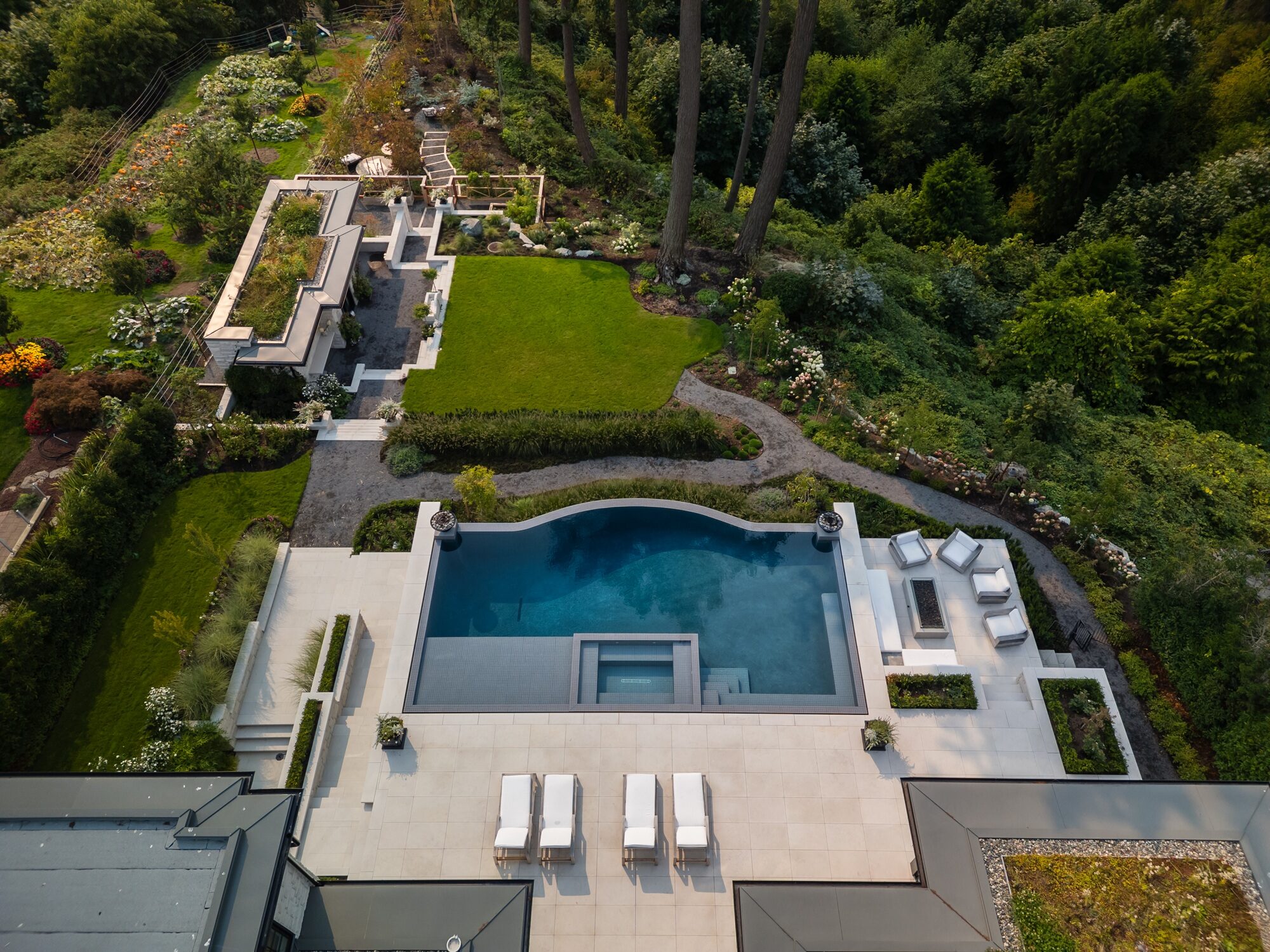 Anchoring the expansive terrace, the main pool is designed as a grand focal point with a 34’0″ long infinity edge that drops 6’0″ to a lower garden level, creating a striking water wall effect against the landscape. A generous baja shelf invites relaxed lounging at the water’s edge, while the inset whirlpool, finished in matching monsoon glass tile, appears to float seamlessly within the main pool.