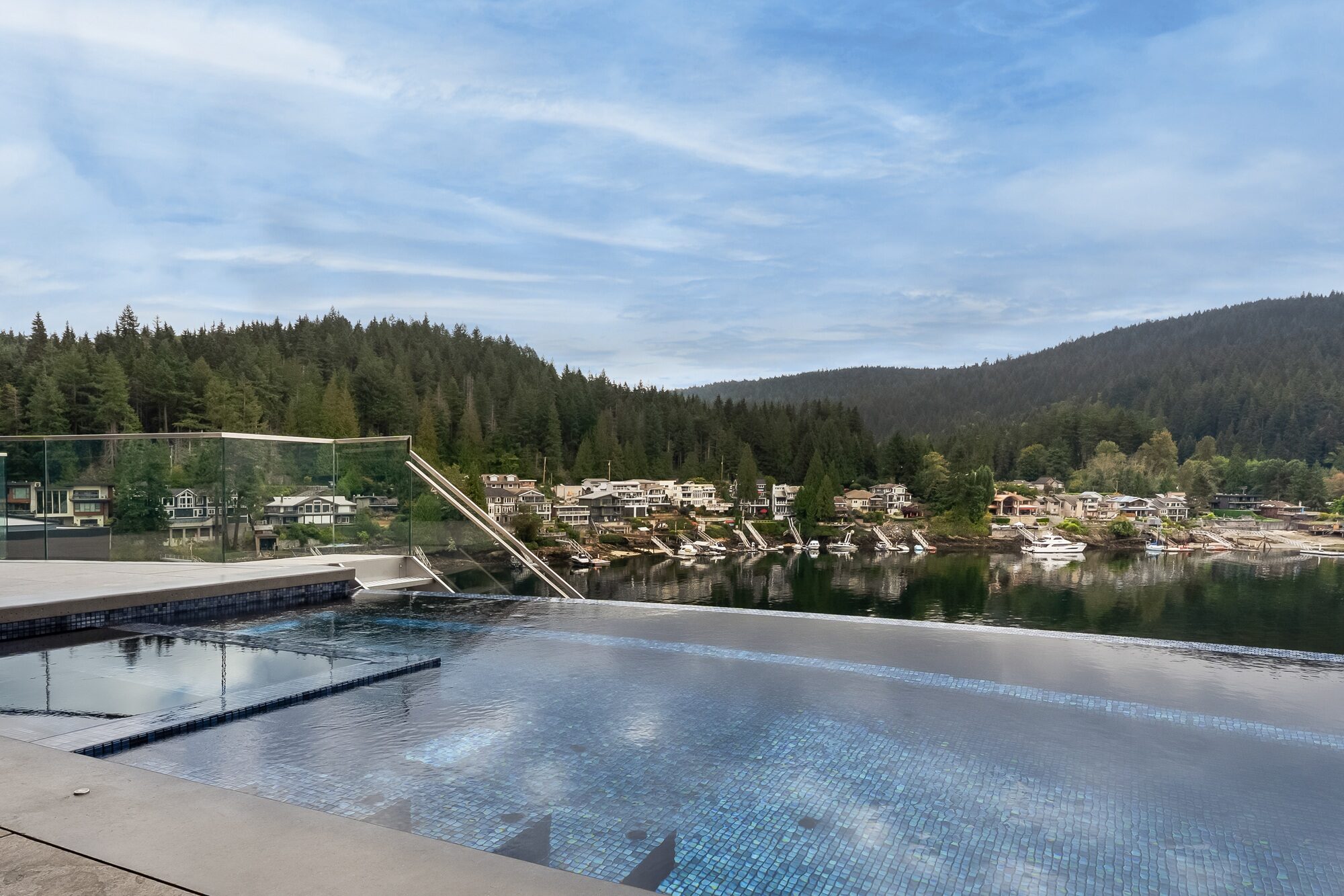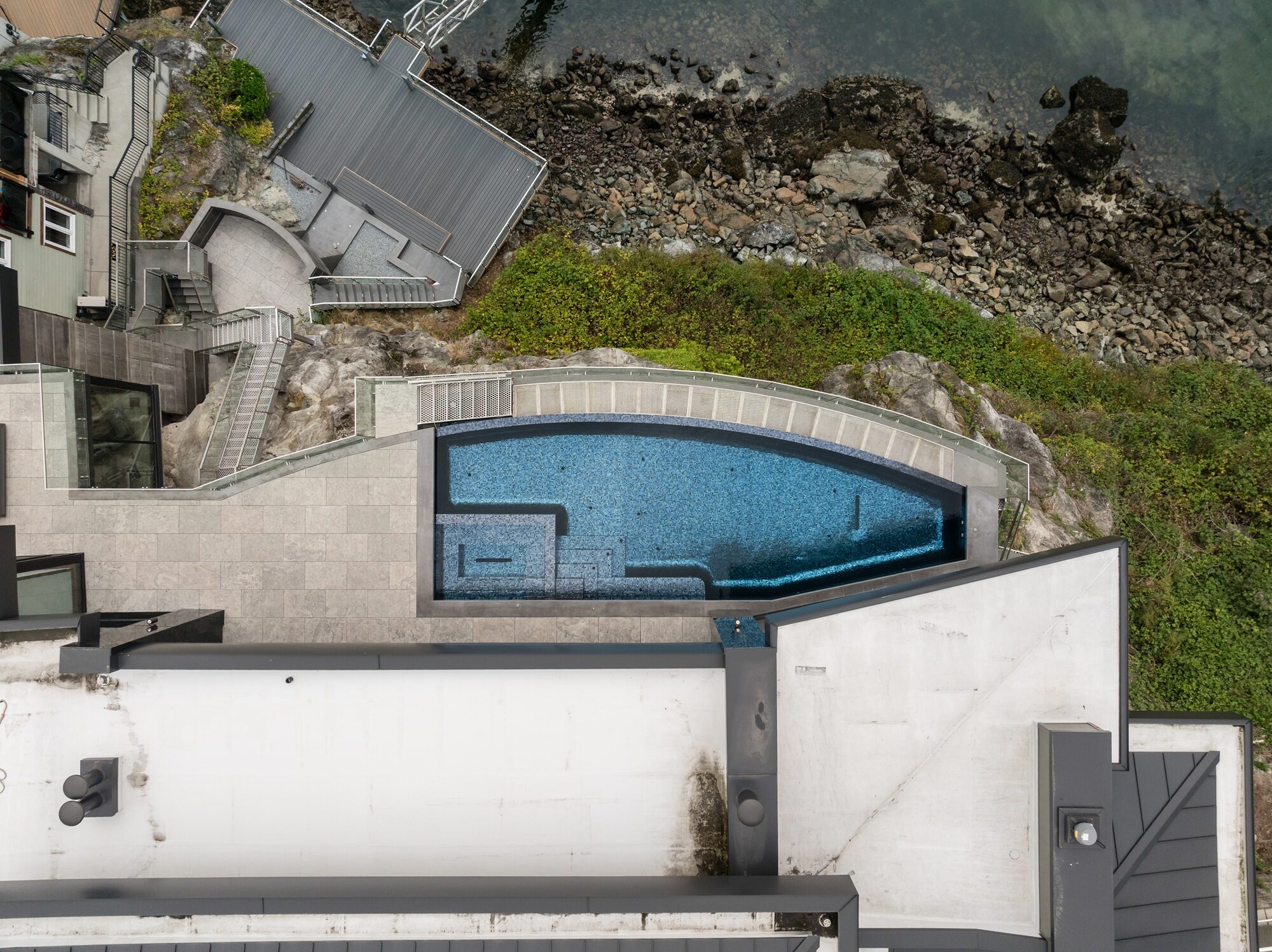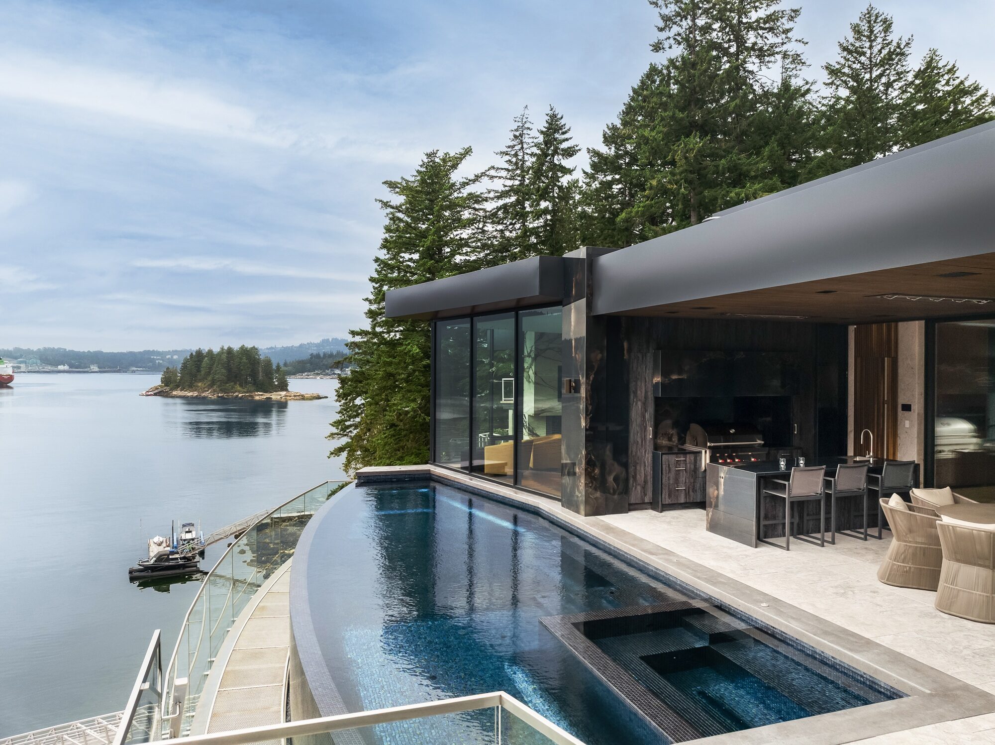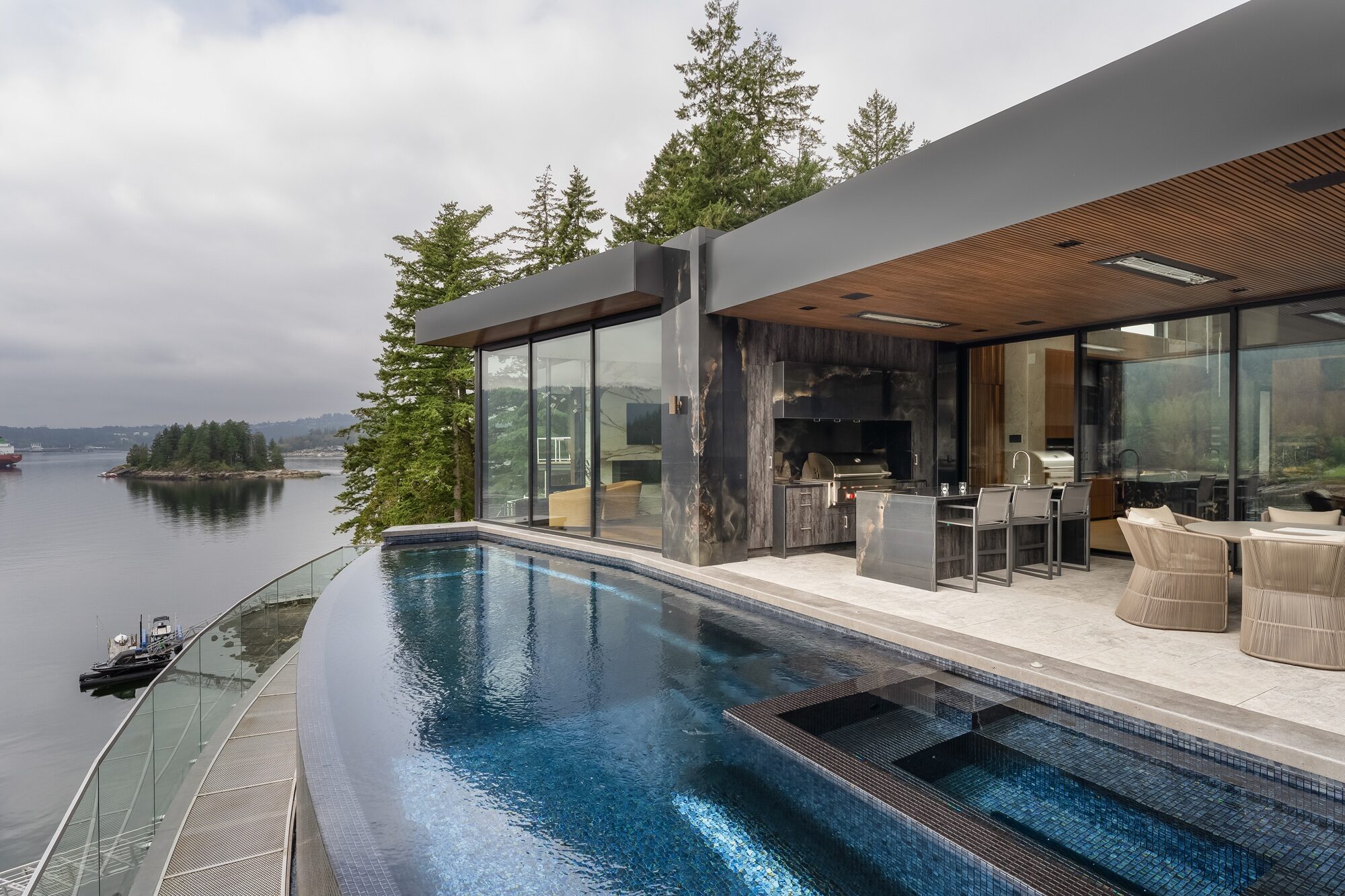 Perched high above the shoreline in Belcarra, BC, this signature Sapphire pool traces the curve of the coastline with a sweeping, curved infinity edge that appears to spill directly into the inlet below. The glass-walled residence and covered outdoor living area extend right to the water’s edge, creating a seamless flow between indoor comforts and the dramatic West Coast setting.