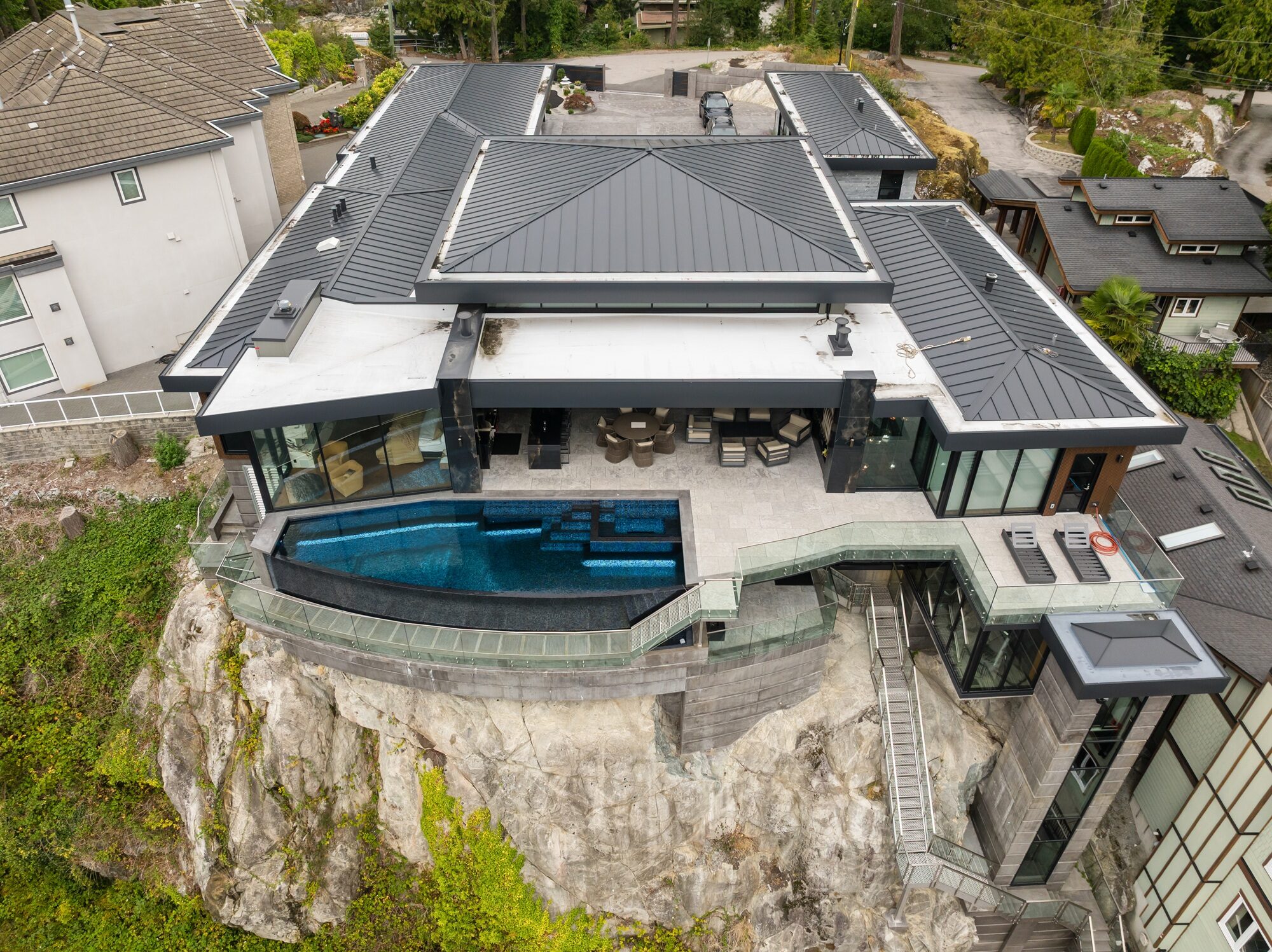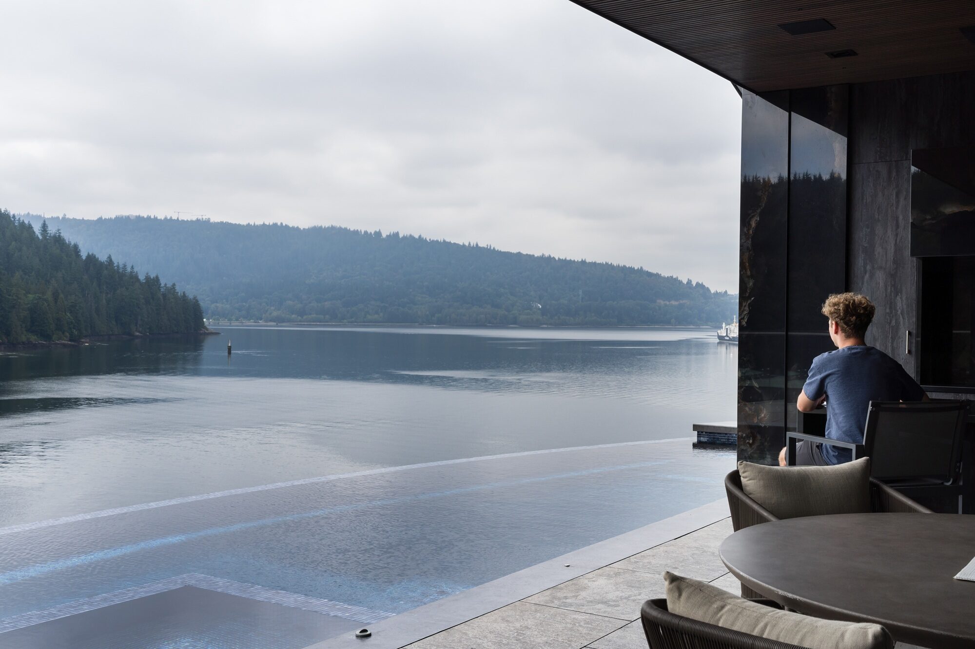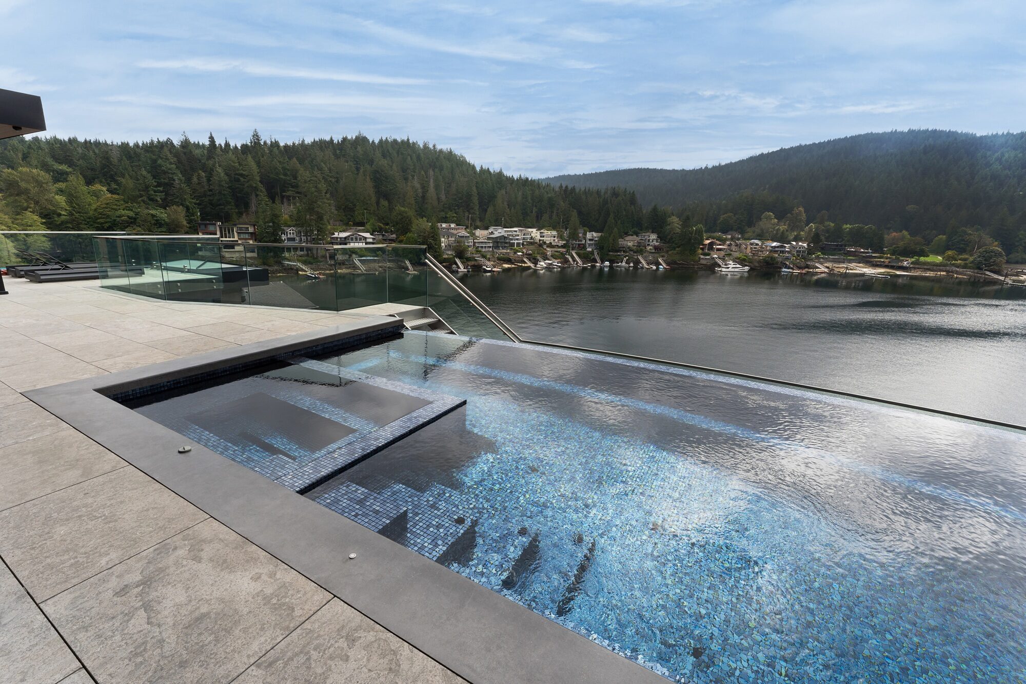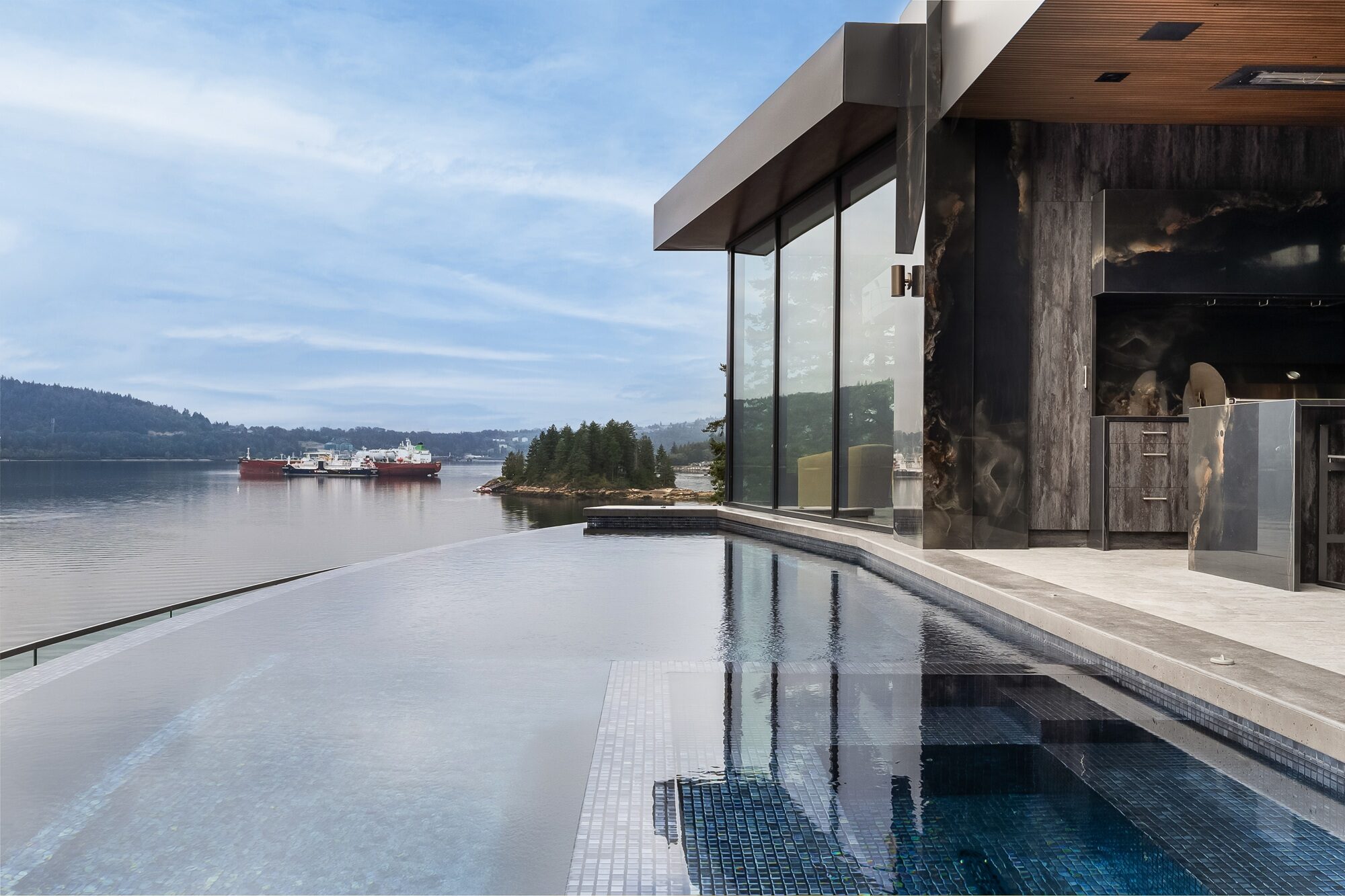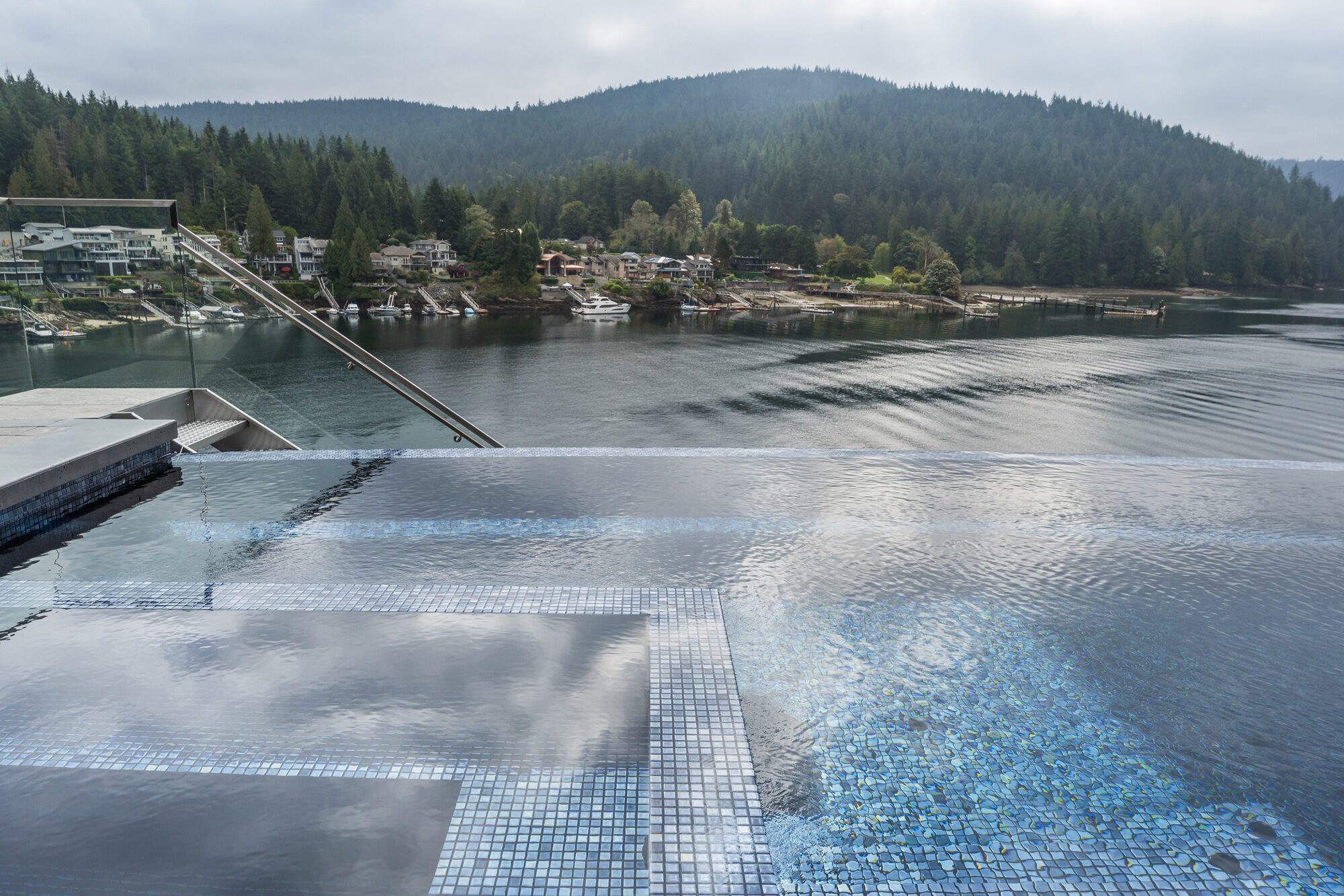 Perched high above the shoreline in Belcarra, BC, this signature Sapphire pool traces the curve of the coastline with a sweeping, curved infinity edge that appears to spill directly into the inlet below. The glass-walled residence and covered outdoor living area extend right to the water’s edge, creating a seamless flow between indoor comforts and the dramatic West Coast setting.