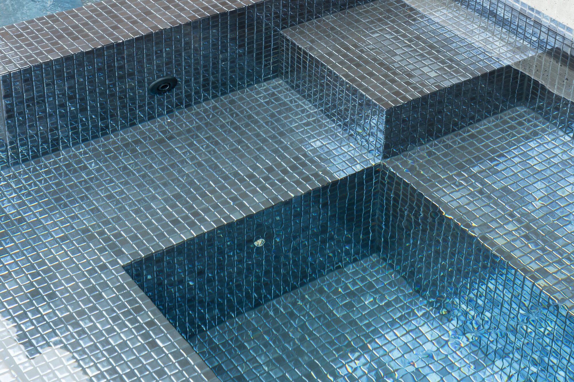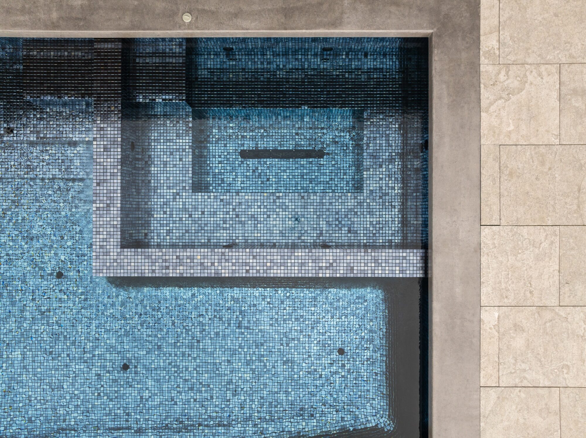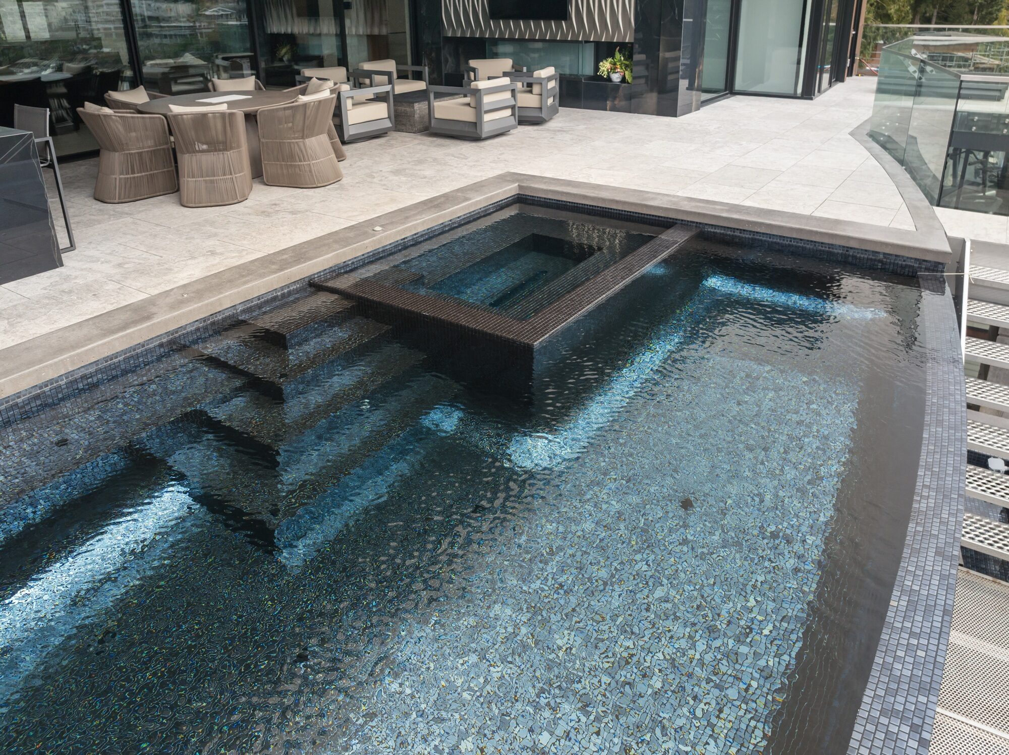 The all glass-tile interior shimmers in shifting shades of blue, giving the water remarkable clarity and depth while catching every change in coastal light. Along the vanishing edge, water slips silently over the radius wall, extending the horizon and framing uninterrupted views of forest, ocean, and sky. At night, integrated colour lights transform the water into a luminous ribbon, washing the infinity edge and adjacent spa with a soft, ambient glow that reflects off the glass tile like jewelry.