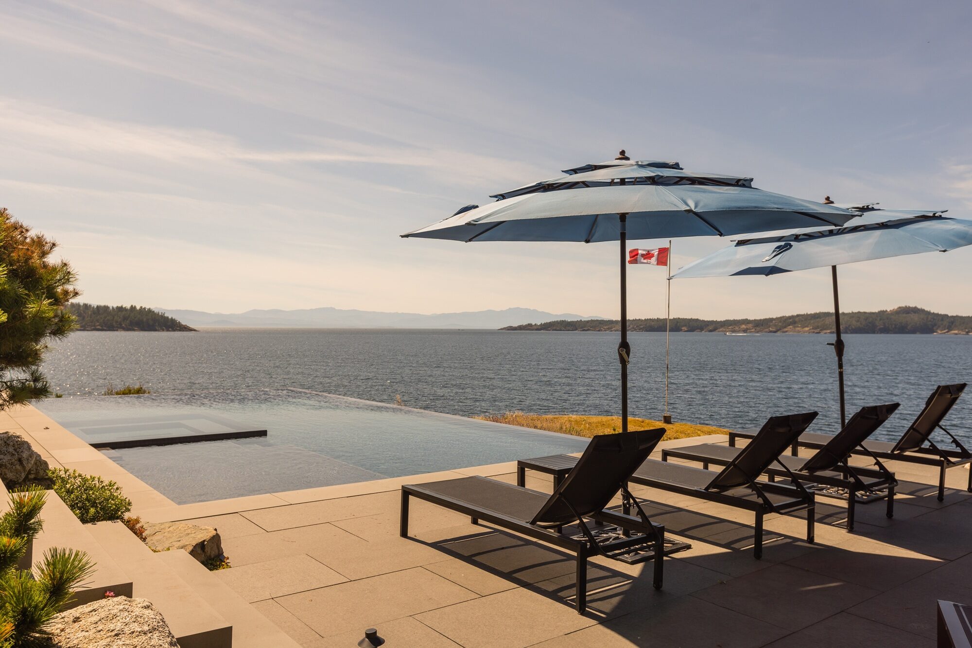 This luxury infinity edge pool in Halfmoon Bay is a stunning showcase of waterscape artistry, thoughtfully designed to harmonize with its extraordinary oceanfront setting. The panoramic views across the bay are front and center, with the disappearing edge of the pool visually merging into the horizon for an immersive, resort-style experience.